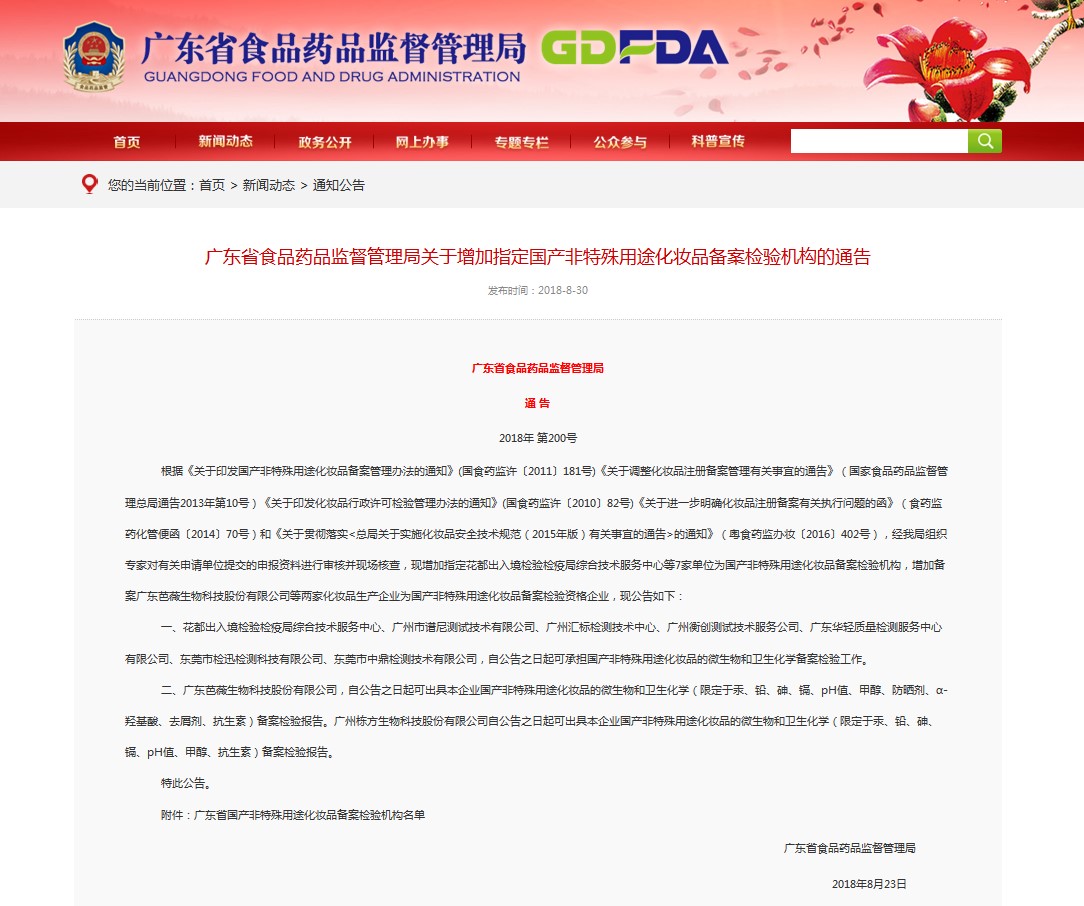 8月23日,廣東省食品藥品監(jiān)督管理局組織專家對有關申請單位提交的申報資料進行審核并現(xiàn)場核查,增加備案廣州棟方生物科技股份有限公司為國產非特殊用途化妝品備案檢驗資格企業(yè),廣州棟方生物科技股份有限公司自公告之日起可出具本企業(yè)國產非特殊用途化妝品的微生物和衛(wèi)生化學(限定于汞、鉛、砷、鎘、pH值、甲醇、抗生素)備案檢驗報告。詳細內容請見《廣東省食品藥品監(jiān)督管理局通告》(2018年第200號)